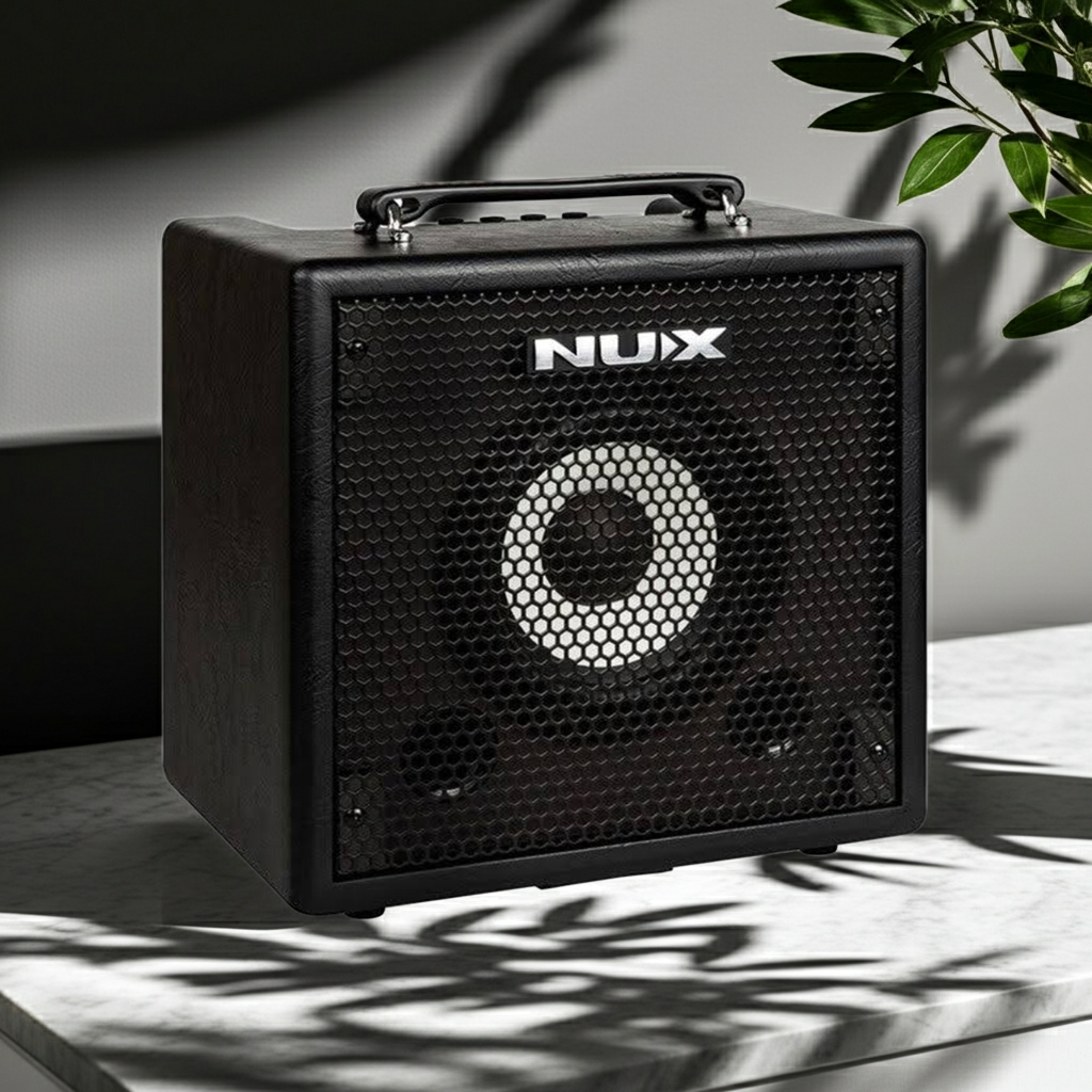 Mighty Bass 50BT is a compact bass amplifier for rehearsal and session work with a host of internal features for the bass guitarist. Incorporating the proprietary TS/AC technology and Impulse Response modelling, a wide range of amplifier and speaker types are at the player's disposal that belie the cabinet's compact dimensions. For rehearsal, the Mighty Bass 50BT has a 50W class D power amplifier to cut through and deliver full bass response to the custom 6.5" speaker unit. A full arsenal of built-in effects and amplifier settings can be edited onboard or via Bluetooth using the NU-X MightyAmp app for ios or andriod, and saved to the 3 internal channels. Bluetooth can also stream audio to the Mighty Bass 50BT for backing tracks to play along with and the MightyAmp app also has access to a digital drum section and jamtracks for solo rehearsals. More in-depth editing is available via USB when connected to a PC or Mac using the Mighty Bass 50BT editor software, whilst also providing an audio interface for recording and port for firmware updates. Connecting a foot switch can provide on-the-fly control of the drum machine and internal phrase looper. Additional AUX input, headphones out and balanced DI output make the Mighty Bass 50BT one of the most comprehensive bass amplifiers available, with all the tools necessary for almost any musical setting.